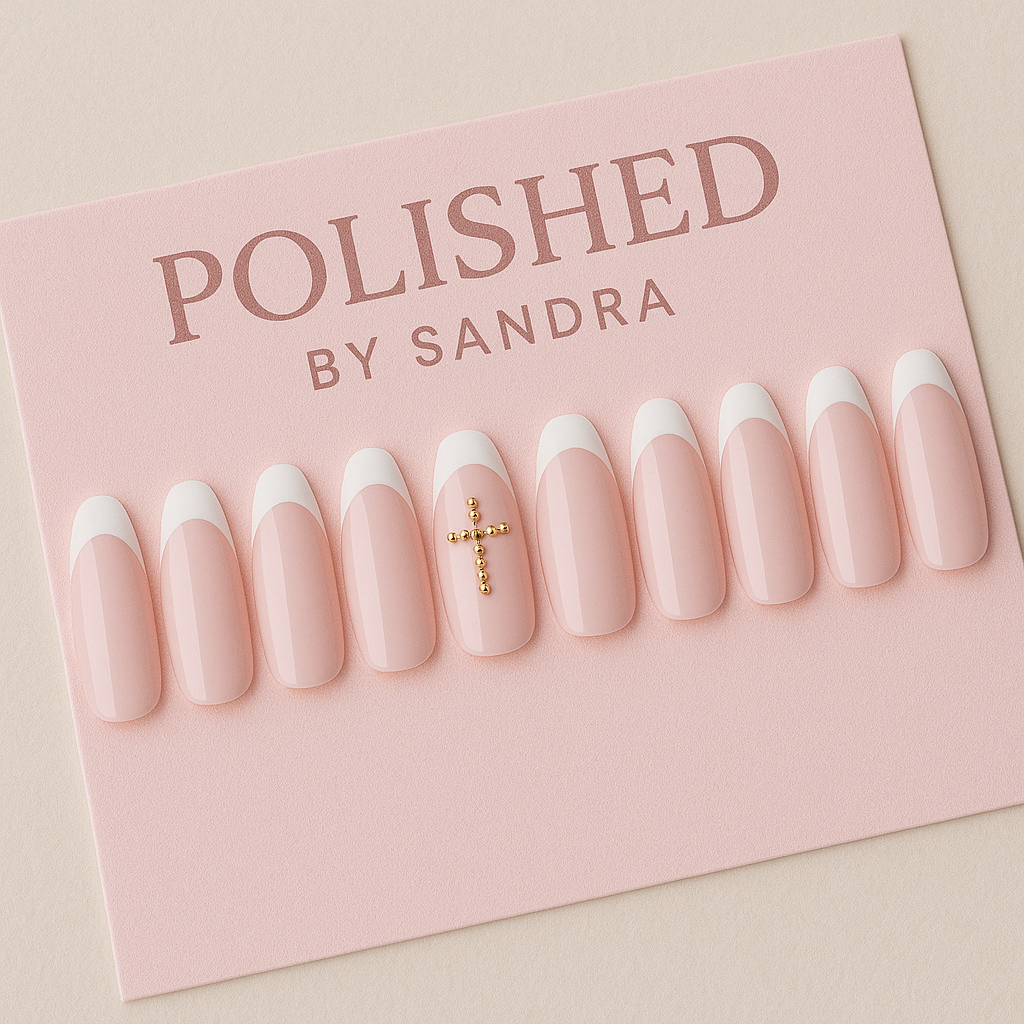 Bring elegance and faith together with our Graceful Cross press-on nails. Featuring a soft pink base with timeless French tips and accented by delicate gold crosses, this set blends beauty with meaning for a style that’s both classy and spiritual.